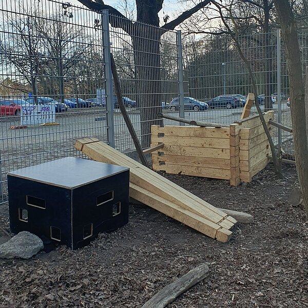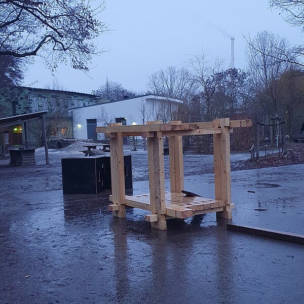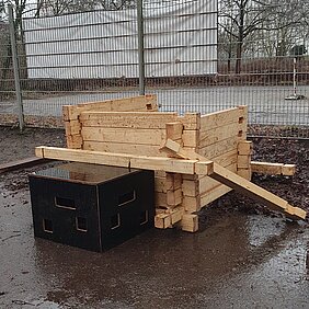 Auf Grundlage früherer Vorlagen und Konzepte entstand die neue Bewegungsbaustelle in Kooperation mit der Tischlerei der LebensWerkGemeinschaft. Sie besteht aus 22 Balken, vier Kanthölzern und zwei großen Kisten, die die Schüler*innen auf unterschiedlichste Weise verwenden und in ihr Freies Spiel integrieren können. Die Kinder der Lerngruppe „Salamander“ (1. – 3. Jhg.) nahmen die Bewegungsbaustelle am 11. Februar 2026 in Empfang und begannen sogleich mit dem Entdecken und Erproben des neuen Materials. Seitdem entstehen täglich neue Bauwerke und Spielideen, die uns begeistern und die Kreativität und Fantasie unserer Schüler*innen eindrucksvoll sichtbar machen.